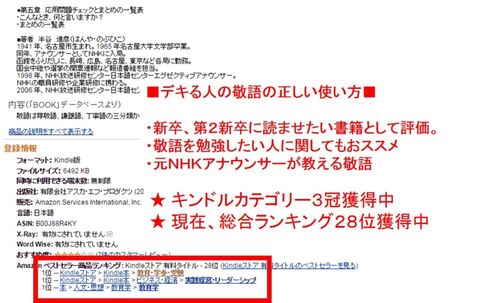 キンドル電子書籍『デキる人の敬語の正しい使い方』(著者:半谷 進彦)が4月28日にキンドルランキングで3つのカテゴリーで1位を獲得 先週の25日から、3つのカテゴリーで1位を獲得し評価されています。キンドル総合ランキングでも27位獲得中。1…